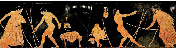 These images from a vase show some typical athletes in training. Note the kind of equipment they are using - javelins (spears), weights, etc.